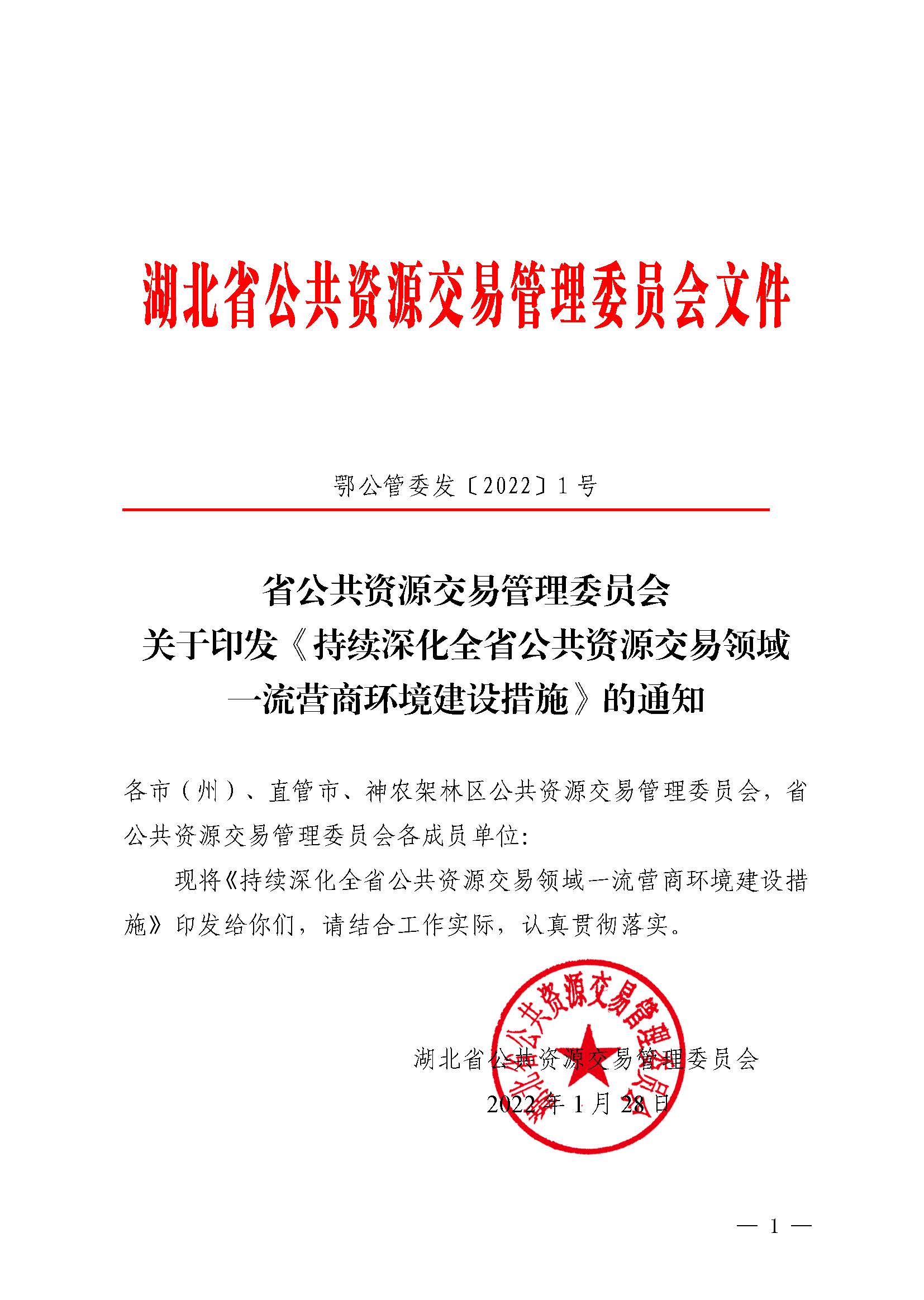 省公共资源交易管理委员会关于印发《持续深化全省公共资源交易领域一流营商环境建设措施》的通知(鄂公管委发〔2022〕1 号)